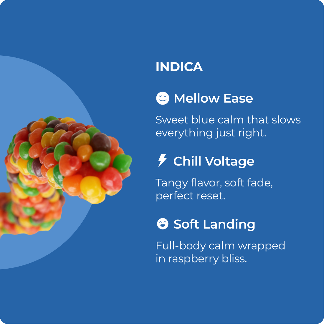 Candy-coated rope bursting with bombastic Blue Razz flavors, delivering smooth, full body relaxation and nostalgic joy.