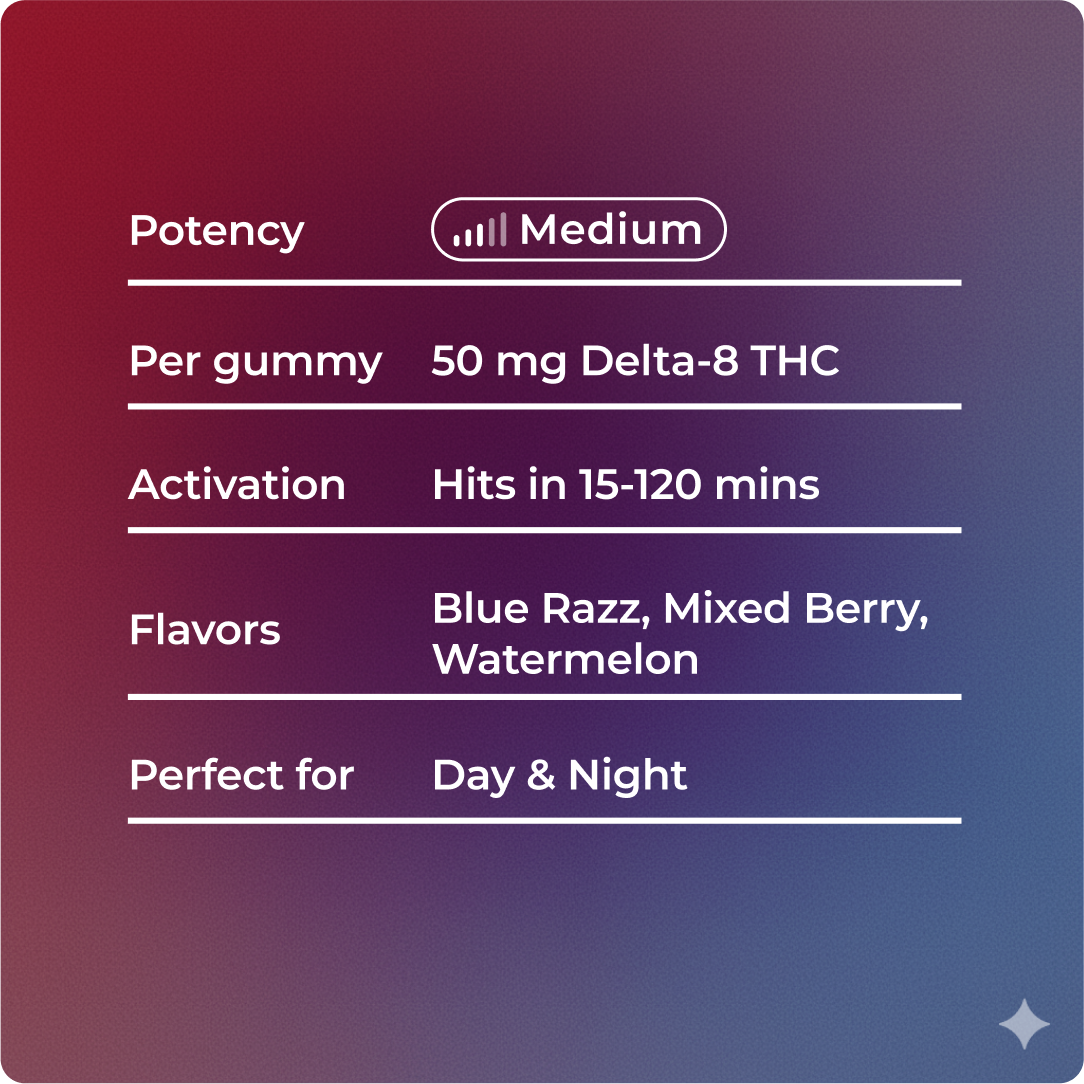 The Delta 8 Vegan Gummies Bundle from Indacloud is designed to offer both variety and value. Each bundle contains a total of 30 gummies, split across three packs. Each pack, offering a unique flavor - Berry High, Blue Razz, and Watermelon Rush, contains 10 gummies. This assortment allows users to enjoy a range of delicious tastes while benefiting from the potent effects of Delta 8 THC, making it a fantastic choice for those new to Delta 8 or seasoned users looking for variety.