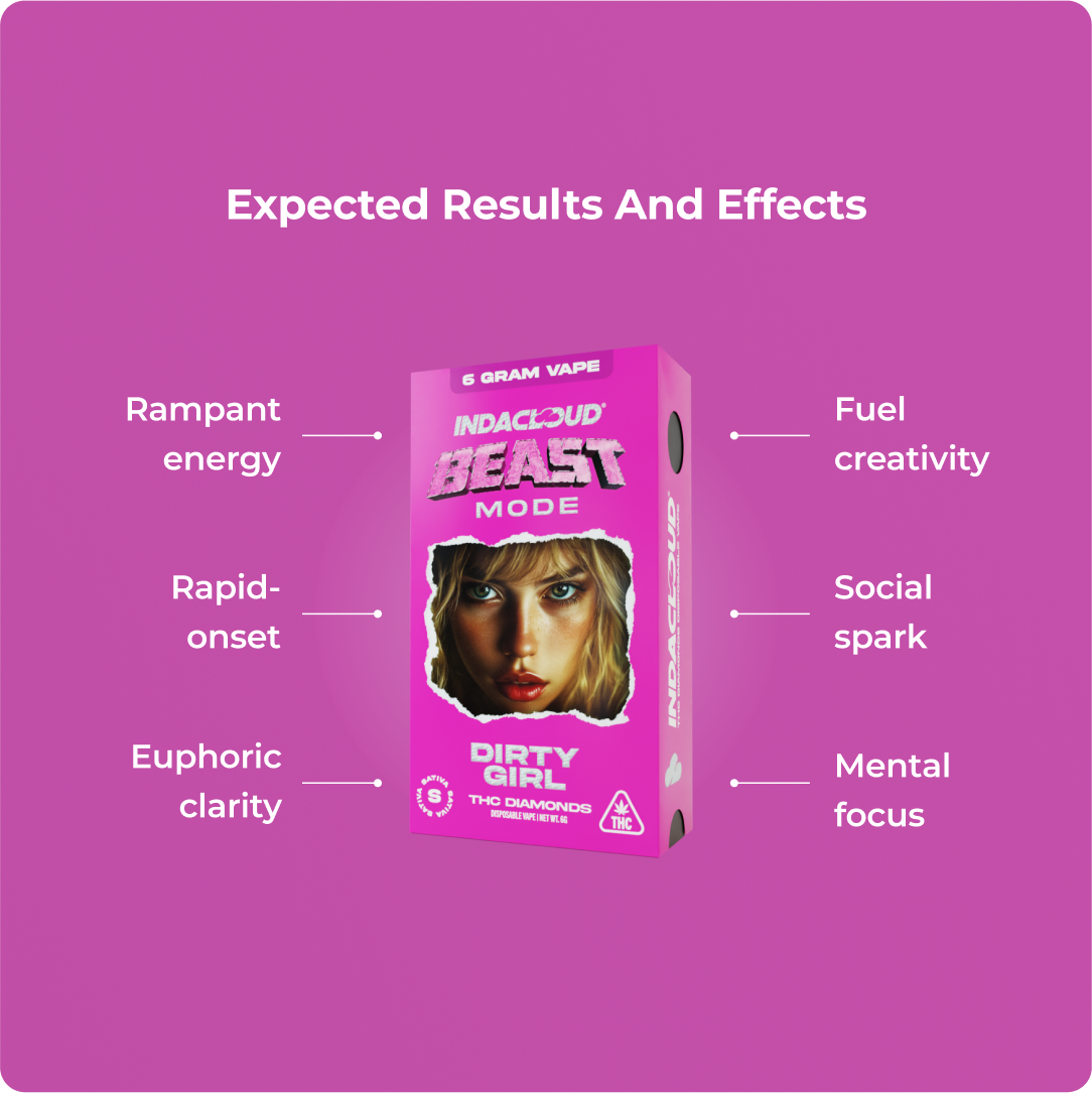 Lemon-pine electricity meets total knockout THCA diamonds, Dirty Girl Beast Mode ignites high-energy creativity and sharp euphoria in a sleek 6g disposable.