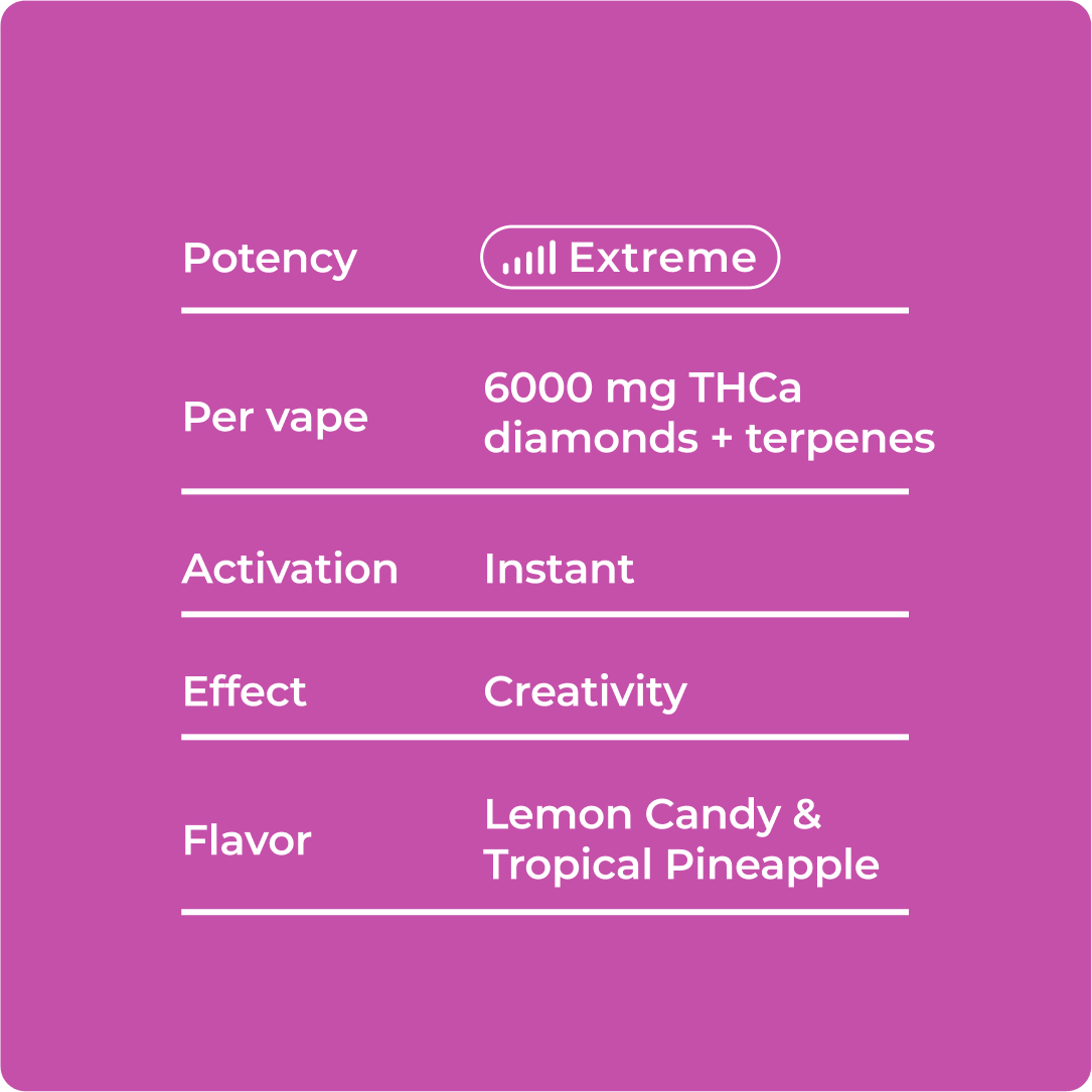 • Rampant energy and euphoric clarity hit fast, fueling creativity and social spark this is “party in vapor form” with cerebral depth and sharp mental focus