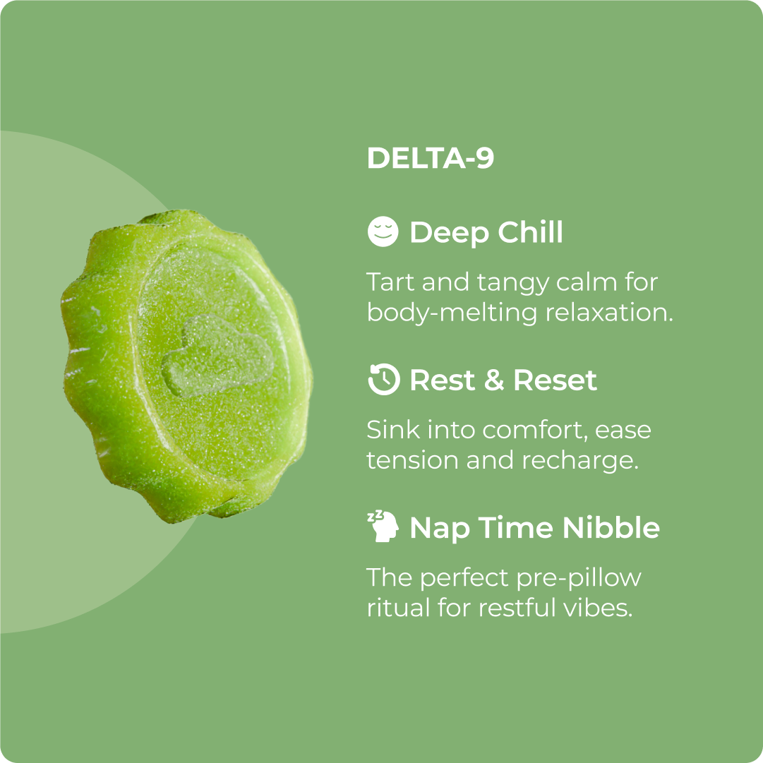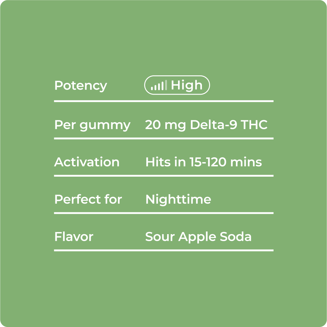 Bold flavor and strong relaxation effects in every satisfying bite. Sharp sour-apple gummies are a perfect pick-me-up or chill-out treat.